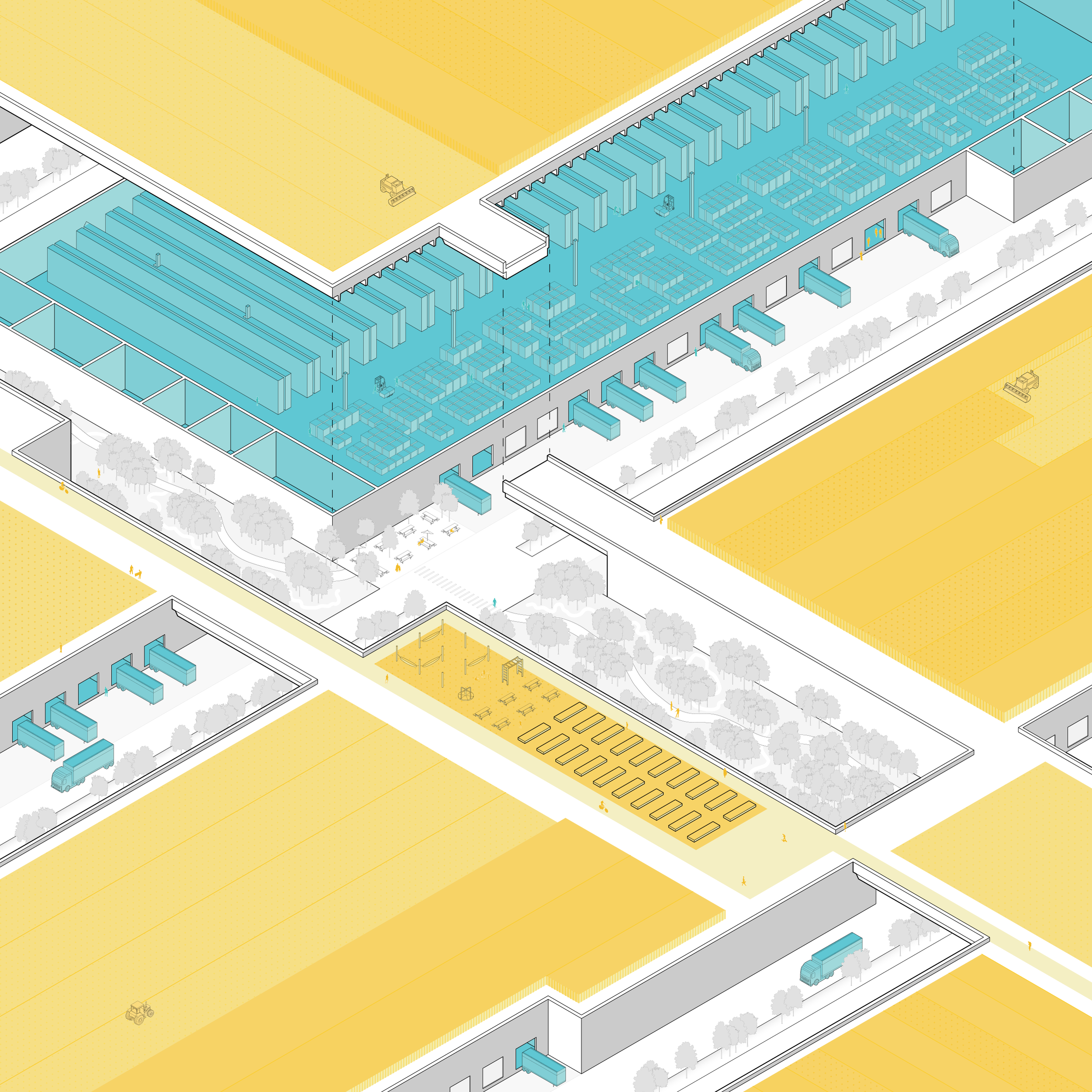This project suggests an alternative planning strategy for distribution clusters that would rezone future warehouse districts in support of both rooftop agriculture and recreational parkland. In this proposal, multiple warehouses are compacted into an efficient mat configuration, with loading zones and trucking lanes thread in between. Air-rights transfers and robust roof structures generate developable farmland above efficiently networked clusters of warehouse buildings. A cut-and-fill operation depresses grade by several feet while lifting existing topsoil to the warehouse rooftops, facilitating ease of pedestrian access to rooftop levels from adjoining streets and neighborhoods. Parking lots and loading zones work in concert with distributed ecological systems to provide the necessary wind breaks, water catchment areas, and species habitat to support both agricultural and ecological productivity. Lastly, the introduction of recreational bike paths, playgrounds, and community gardens in and among the farming plots offers up these reclaimed roofscapes for public use and generates an unlikely typology of urban agricultural parkland—an elevated public farm that fuses normally conflicting programs into a singular, symbiotic urban ecology.